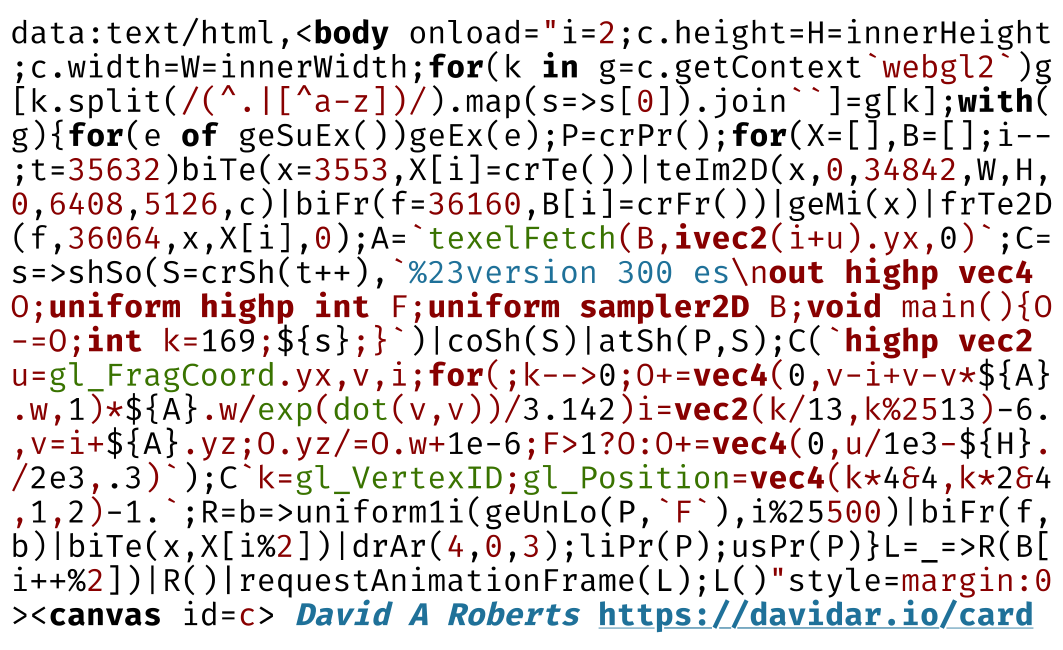 A self-contained version of my tiny fluid simulation, compressed to fit on the back of a business card.